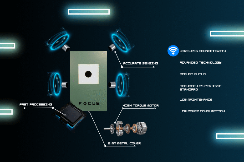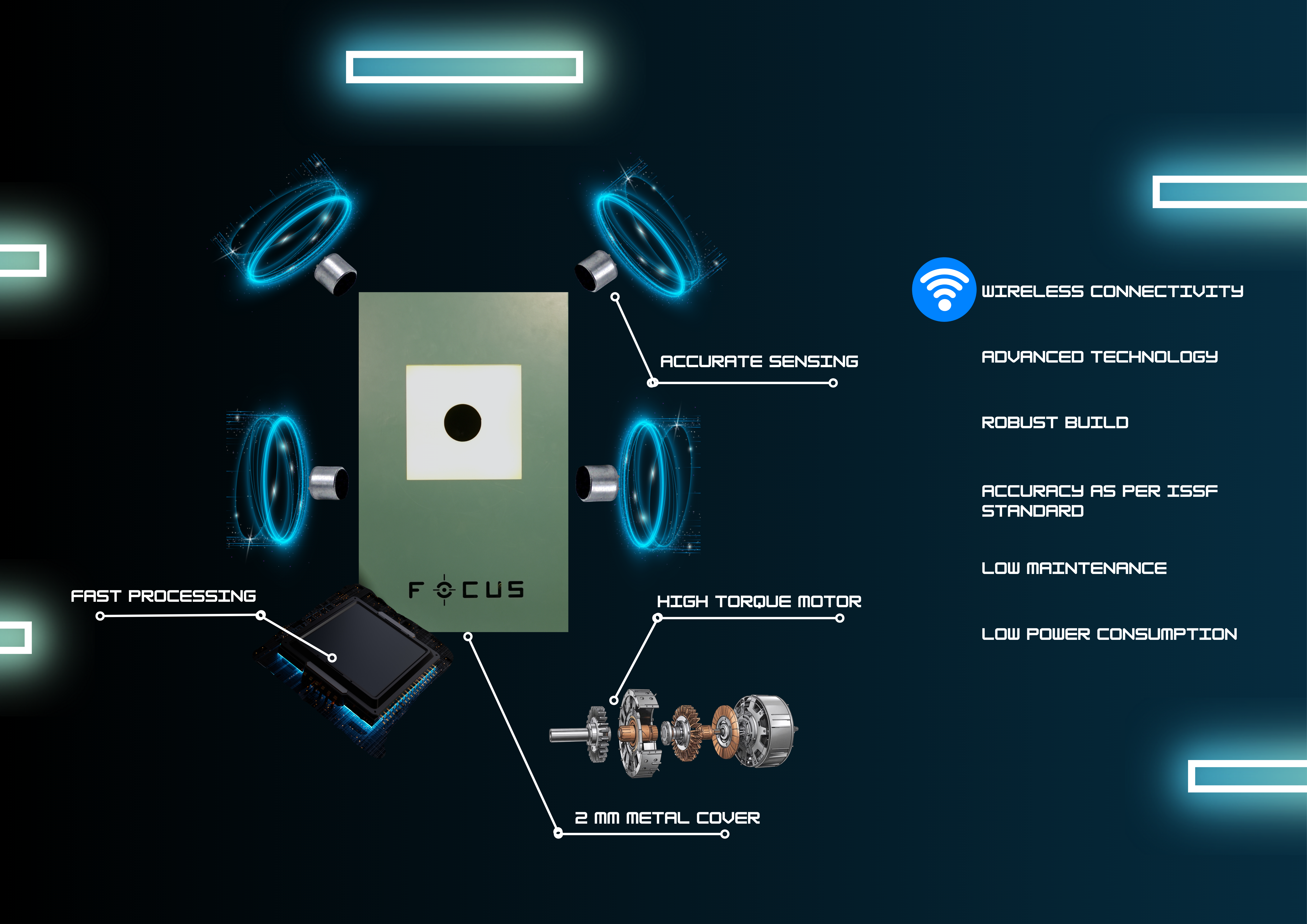 We ensure cutting edge technology at your doorsteps so that you can train like world champions and Olympians. Your shots are analysed by 4 X high end acoustic sensors and computed by fast processing microcontroller to project the exact location where your shot landed. Our technology ensures sub millimeter accuracy as per ISSF standards enabling the shooters to be aware of their present skillset. Focus is a 2-in-1 target which is used by both Pistol and Rifle shooters for practice and match.The system has been designed WIRELESS to mitigate the usage of long cables in the ranges.Advanced software ensures modes like Sighters/Match/Finals and generation of detailed report at the end of each event.The Mean point of Impact(MPI) and mean group are updated on the target with the progress of each shot.The Zoom feature may be used for magnified display of target. The system has both Auto and Manual Calibration modes to mitigate infrastuctural defects / various misalignments.